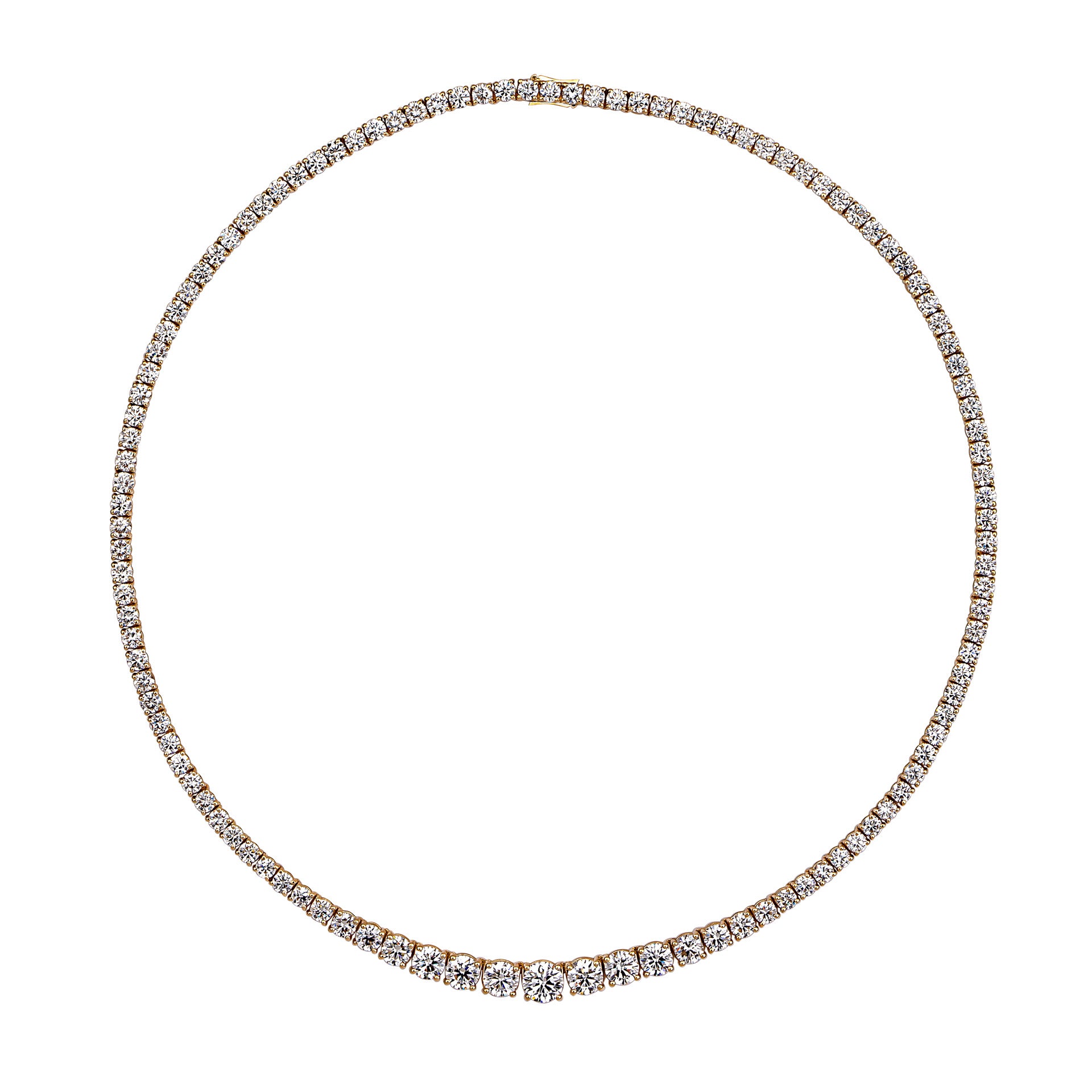 Behold "Jeneve," the ultimate showstopper. This yellow gold diamond necklace boasts a breathtaking display of diamonds, from top to bottom. At its heart, a magnificent centerpiece diamond steals the spotlight, creating an absolute spectacle of beauty. The stones around the Jeneve grow from a small jewel the size of 0.1 carats all the way down to the centerpiece, that features a stunning 1 carat jewel.